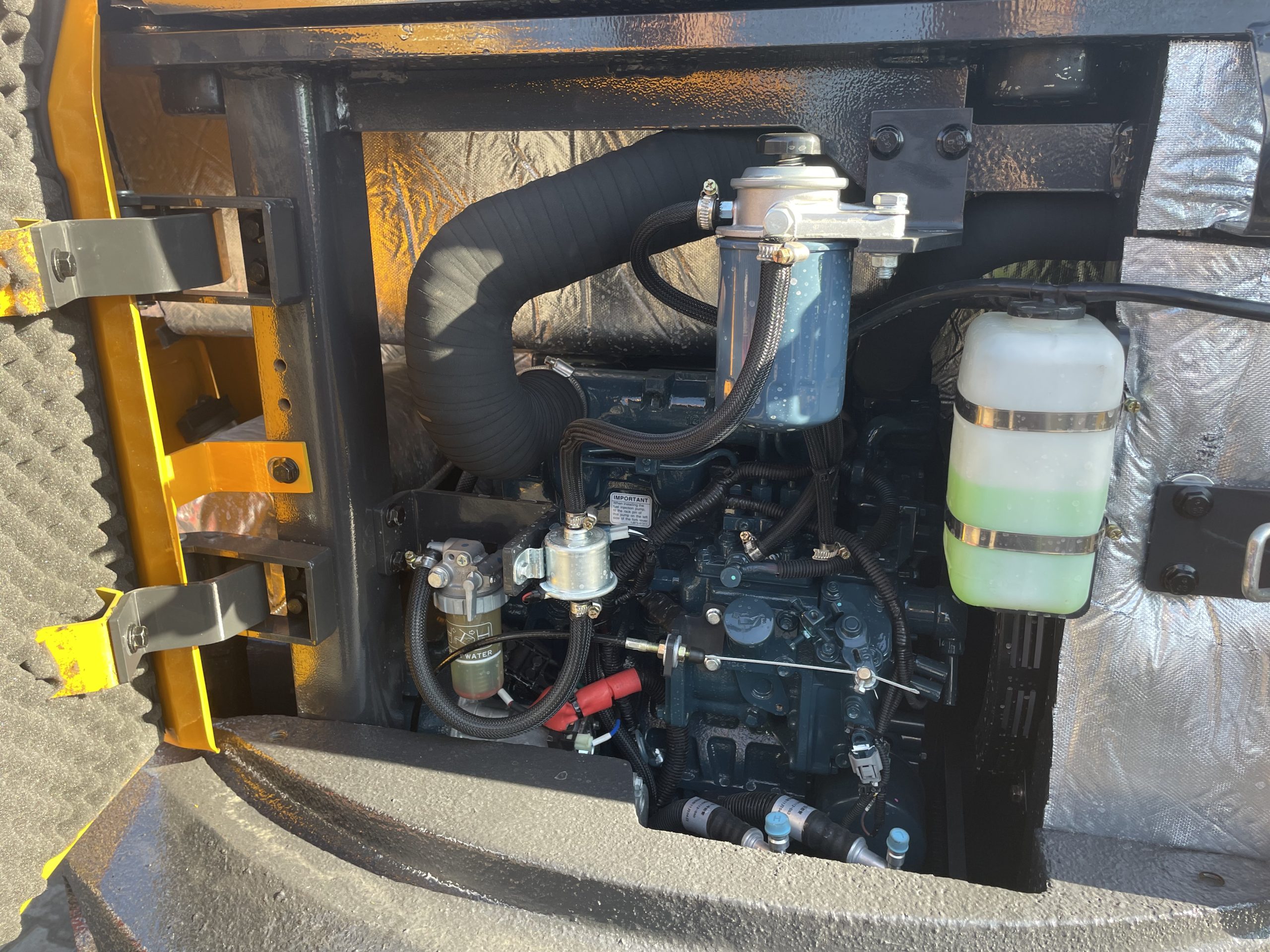 Die Maschine ist mit einem zuverlässigen Kubota D1703 Motor mit einer Leistung von 18,5 kW (25 PS) bei 2200 U/min ausgestattet. Der flüssigkeitsgekühlte Vierzylinder mit mechanischer Einspritzpumpe sorgt für einen stabilen Betrieb, ein hohes Drehmoment von 97,4 Nm bei 1500 U/min sowie eine lange Lebensdauer. Der zweistufige Fahrmotor ermöglicht eine gleichmäßige Fahrt mit einer Geschwindigkeit von bis zu 4,4 km/h.
